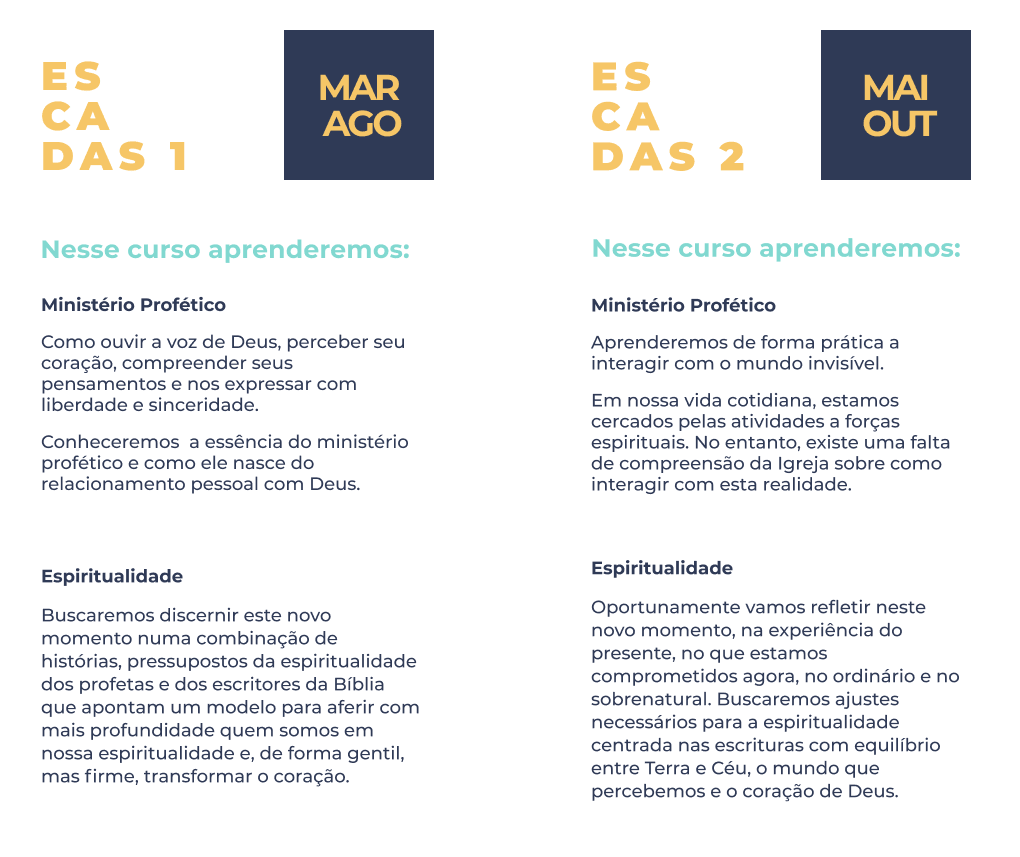 Cada semana, você terá acesso de 2 a 3 vídeoaulas de 40 minutos, 3 webconferências de 60min, 1 Treinamento Profético com mentoria de 120min e 5 fóruns e/ou atividades com prazos de entrega pré-estabelecidos.